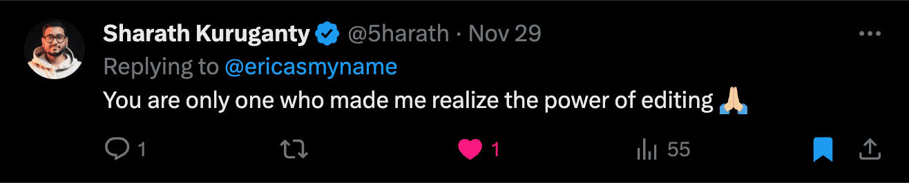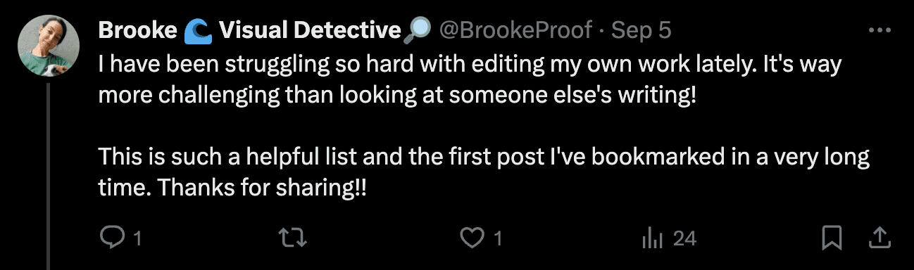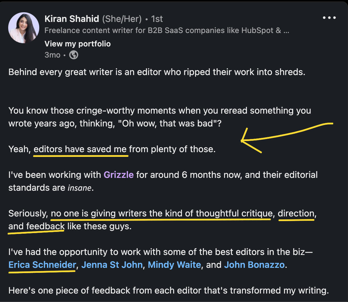 I quickly realized the impact this could have on other writers.So, I became obsessed with teaching writers, content creators, founders, or anyone writing online how to self-edit their content without feeling overwhelmed.