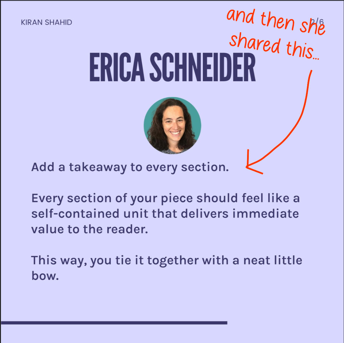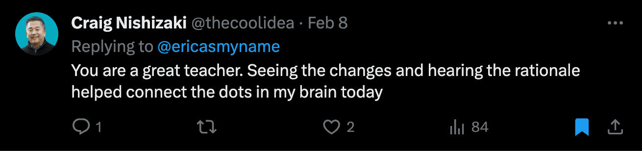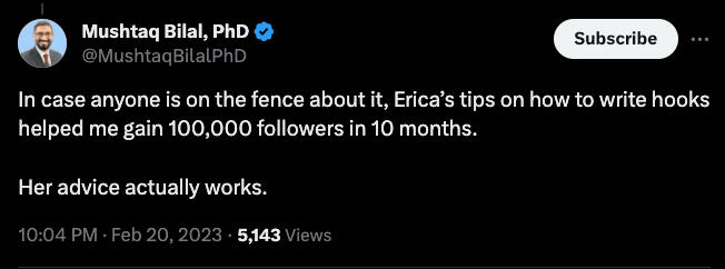 "Erica goes beyond copywriting. She breaks down great writing into actionable frameworks with the examples and receipts to back them up."